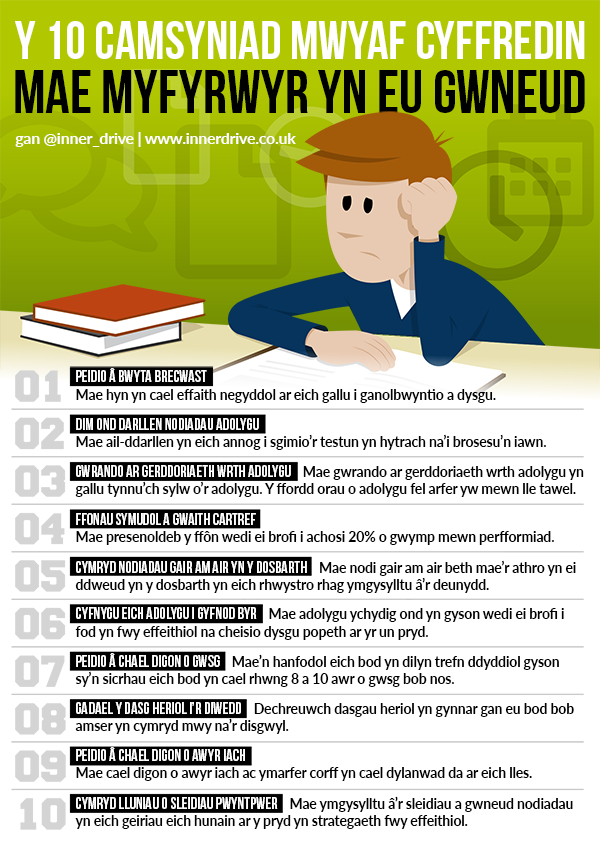 Y 10 camsyniad mwyaf cyffredin mae myfyrwyr yn eu gwneud